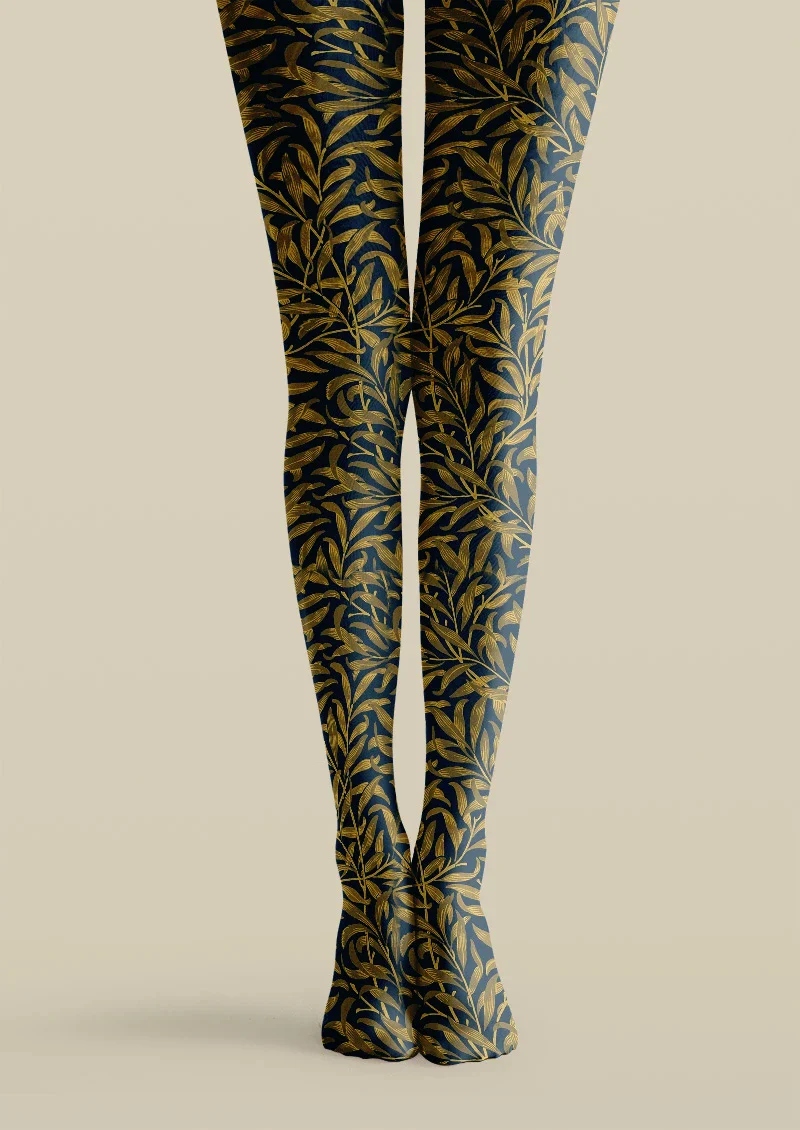 Elegant botanical-print tights in gold and black for refined, classic styling.