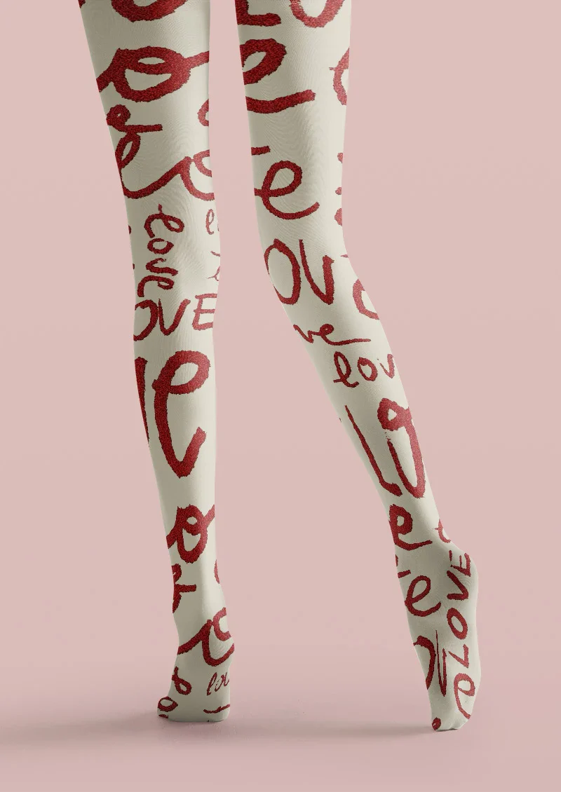 Love Script tights feature romantic handwritten words for a sweet Valentine-inspired style.