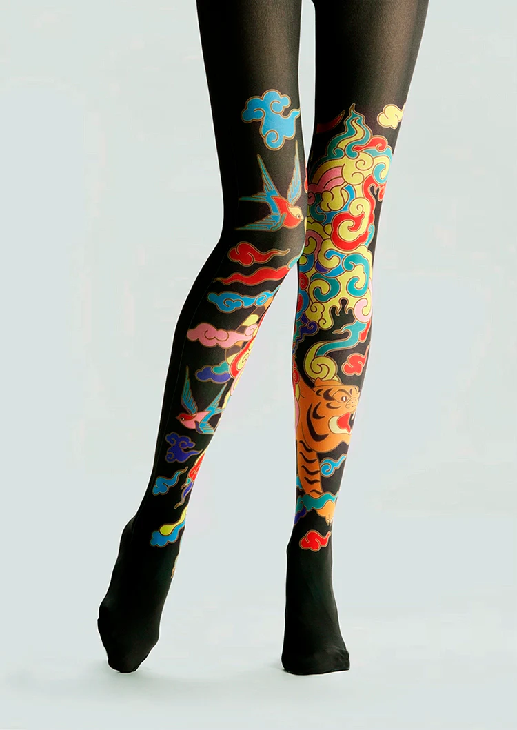 Unleash your bold side with Viken Plan’s Tiger Totem tights. Graffiti-style ethnic print pantyhose blending fierce energy and artistic expression.